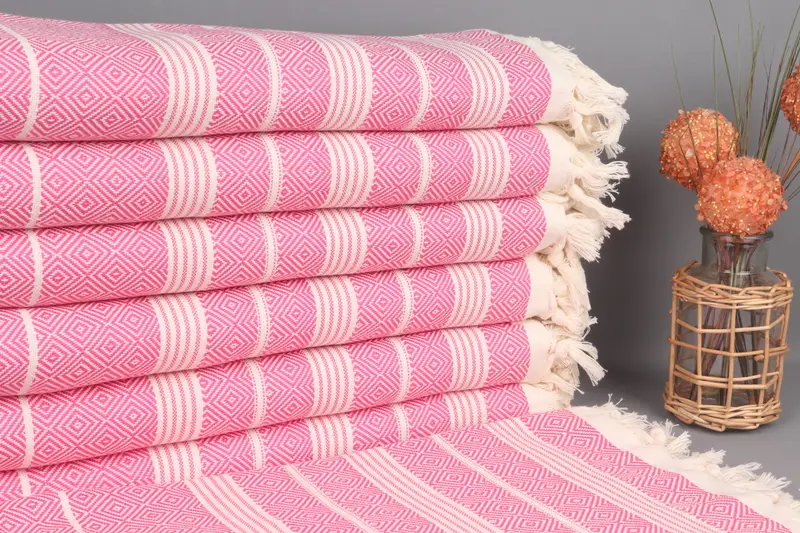 The Turkish towels are woven using first quality organic Turkish cotton yarn, ensuring high absorbency and durability. Characterized by their flat-weave technique, these towels measure 38x69 inches (95x175 centimeters) with a tolerance of ±2.5 centimeters due to hand-weaving. Each towel weighs 440 grams, offering versatility for various uses, including kitchen, bath, and travel.