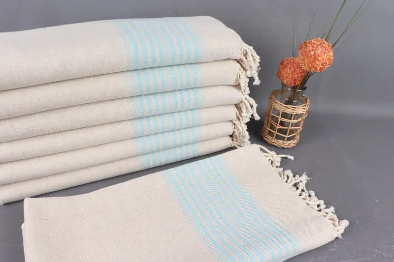 The Turkish beach towel is composed of organic cotton yarn, ensuring durability and eco-friendliness. Measuring 40x79 inches (100x200 centimeters) with a weight of 315 grams, the hand-woven towel offers a tolerance of up to 2 inches (5 centimeters). The fibers absorb moisture effectively, making it versatile for various uses.