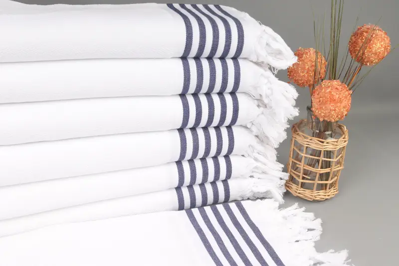 The Turkish beach towel is made from 100% organic cotton yarn, ensuring a natural and eco-friendly choice for consumers. Its size is 40x67 inches, translating to 100x170 centimeters, with a tolerance of up to 2 inches (5 centimeters) due to hand-weaving techniques. Weighing 360 grams, the towel is both lightweight and highly absorbent.