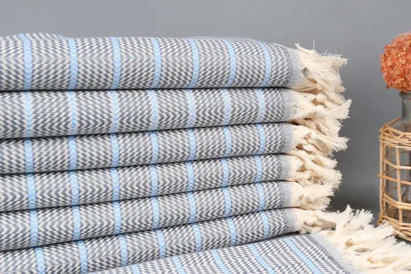 The Turkish beach towel is woven using organic cotton yarn, ensuring high quality and durability. The towel measures 40x71 inches (100x180 cm) with a tolerance of 2 inches (5 cm) due to hand-weaving techniques. This results in a lightweight, absorbent towel weighing 440 grams.