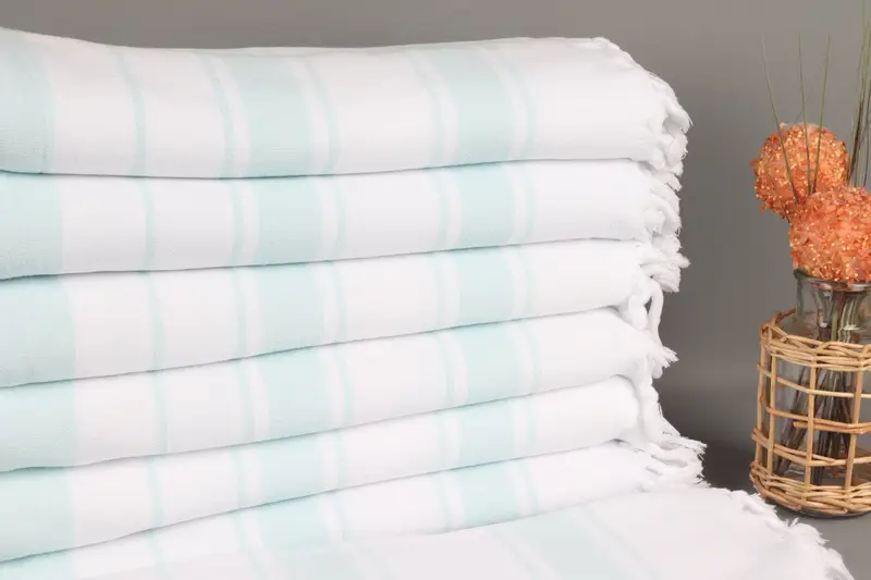 Turkish towels are made from organic cotton yarn, ensuring a sustainable and high-quality fiber composition. The hand-weaving process results in a versatile product, characterized by its ability to be used on both sides. The towels measure 36x67 inches (90x170 centimeters) with a weight of 450 grams, and the size can vary by up to 2 inches (5 centimeters) due to the manual weaving process.