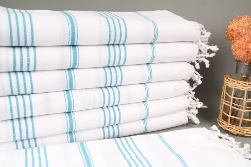 Organic cotton yarn constitutes the fiber composition of the Turkish towel, ensuring high absorbency and durability. Measuring 40x71 inches (100x180 centimeters) with a tolerance of 2 inches (5 centimeters), the towel weighs 300 grams. Handwoven with precision, the towel exhibits slight size variations, resulting in a personalized touch.