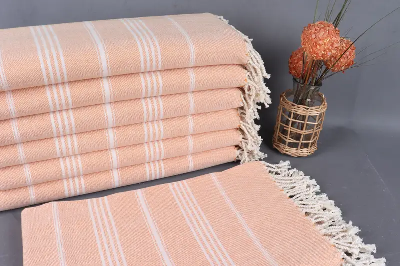 Turkish towels are characterized by their organic cotton yarn construction, ensuring high absorbency and durability. The product, weighing 330 grams, measures 40x67 inches or 100x170 centimeters, with a tolerance of ±2.5 cm due to hand-weaving techniques. These towels can be personalized with embroidery, and orders over 35 USD receive free shipping. Pre-shipment washing is recommended, with machine or hand wash advised without bleach or fabric softener.