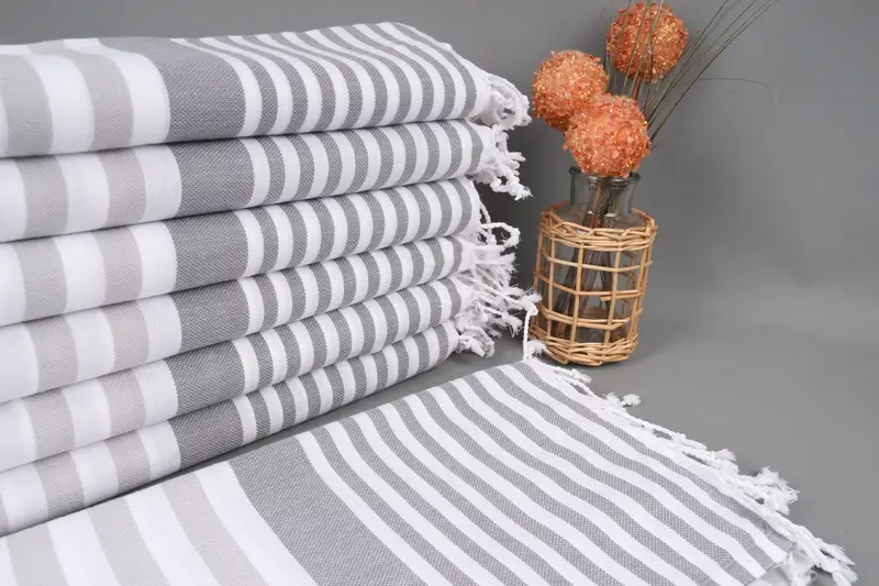 Turkish beach towels are woven from organic cotton yarn, ensuring a high-quality and sustainable product. The material is characterized by its exceptional absorbency and durability, resulting in towels that become softer with each wash. Each towel is meticulously hand-woven with a tolerance of up to 2 inches (5 centimeters) in size due to the manual crafting process.