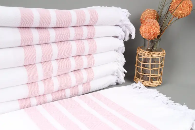 Turkish Towels are composed of organic cotton yarn, ensuring high absorbency and durability. Resulting in an intricate weaving process, these towels measure 40x71 inches (100x180 centimeters) with a weight of 380 grams. The hand-weaving technique allows a tolerance of 1-2.5 centimeters in size, ensuring precision.