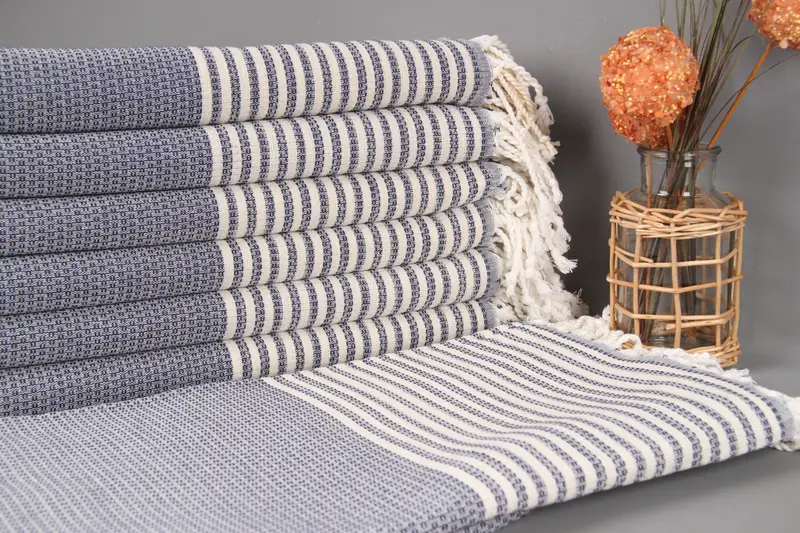 Handmade Turkish beach towels are meticulously crafted from organic cotton yarn, ensuring high-quality fiber composition. These towels are characterized by a size of 40x67 inches (100x170 cm) with a tolerance of up to 2 inches (5 cm) in either direction due to hand-weaving. Weighing 390 grams, these towels offer durability and lightweight flexibility.