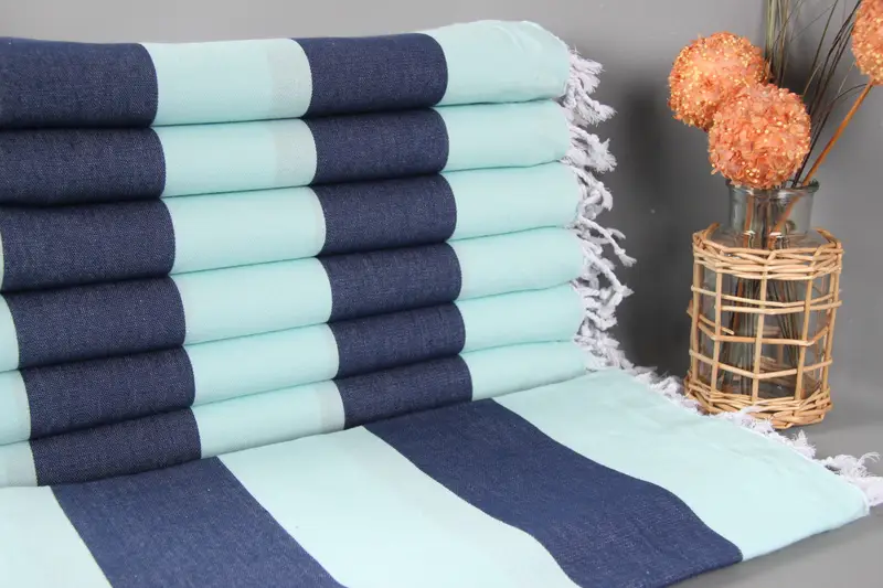 The Turkish beach towel is composed of organic cotton yarn, ensuring its durability and softness. Characterized by its high absorbency, the towel measures 40x71 inches (100x180 centimeters), with each unit weighing 260 grams. Hand weaving results in minor variations of up to 2 inches (5 centimeters).