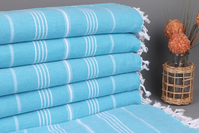 Turkish towels are characterized by their high absorbency and durability, woven from organic cotton yarns. Resulting in a lightweight and versatile textile, the towels measure 40x71 inches (100x180 centimeters), with a weight of 265 grams. Ensuring a tolerance of up to 2.5 cm due to traditional weaving techniques.