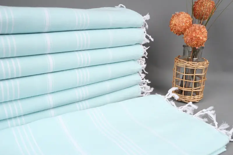 Organic cotton yarn characterizes the Turkish beach towel, ensuring high absorbency and softness. Measuring 40x71 inches (100x180 cm) with a hand-weaving tolerance of 2 inches (5 cm), the towel weighs 265 grams. Embroidery customization options are available, allowing for personalization of the towels or blankets. All towels are pre-shrunk and ready for use. Orders over 35 USD receive free shipping globally within 3-5 days, with options for return or exchange available.