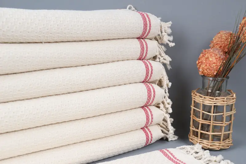 The Turkish hand towel is crafted from 100% organic cotton yarn, ensuring a soft and durable textile. Measuring 18x38 inches (45x95 centimeters) with a weight of 120 grams, this towel allows a weaving tolerance of up to 2 inches (5 centimeters). Hand-weaving techniques facilitate usage on both sides, characterized by its multi-functional utility as kitchen, bath, or face towels.