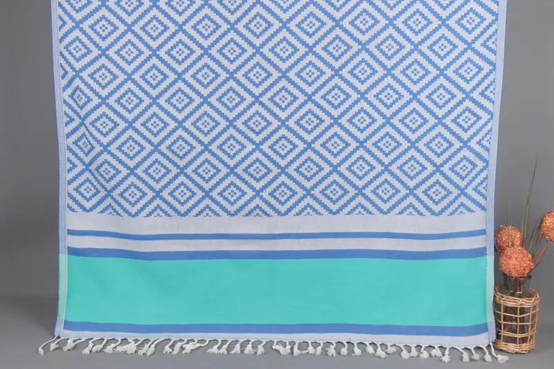 Organic cotton yarn ensures high quality and superior absorbency for the beach towel. Measuring 69x36 inches (175x90 centimeters), this hand-woven towel weighs 420 grams, with a tolerance of 1-2.5 centimeters due to manual weaving techniques. Customization includes embroidery options for personalization. Pre-shrunk, the towel is ready for immediate use. Orders benefit from free shipping for US-based customers when exceeding $35, with worldwide delivery in 3-5 days via FedEx, DHL, or UPS. Return or exchange policies are available without hassle.