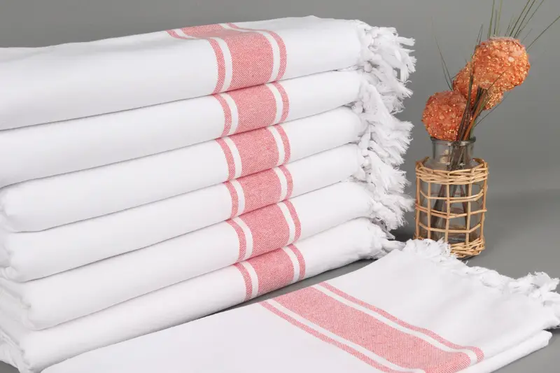 Turkish beach towels are characterized by their high-quality organic cotton yarn, ensuring exceptional absorbency and durability. Dimensions measure 40x71 inches (100x180 centimeters), with a weight of 400 grams. Hand-weaving allows for a tolerance of up to 2.5 cm in size variations.