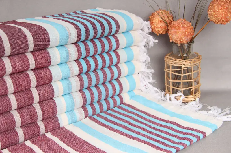 Organic cotton yarn characterizes the construction of the towel, ensuring durability and superior absorbency. The dimensions are specified at 40x67 inches (100x170 centimeters) with a tolerance of 2 inches (5 cm) due to hand weaving, resulting in a total weight of 175 grams. Customization options include embroidery of names or logos, with free shipping offered for orders over 35 USD. Pre-washed towels enhance softness upon first use, and they should not be treated with bleach or fabric softener. Turkish-woven towels facilitate multi-purpose use...