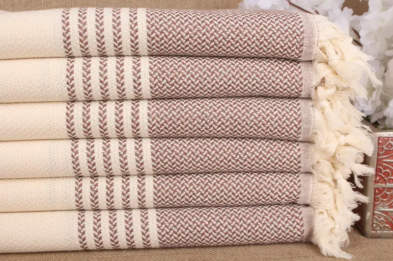 Organic cotton material ensures high absorbency and quick drying, making it suitable for a variety of uses. Characterized by its double-faced knitting, the towel measures 70x40 inches or 100x180 centimeters with a tolerance of ±2 inches or 5 centimeters. Hand-weaving results in a weight of approximately 400 grams.