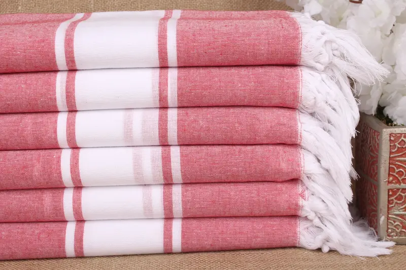 These towels are characterized by their pure organic cotton composition, ensuring high absorbency and quick drying. Each towel measures 40x71 inches or 100x180 cm, with a weight of approximately 290 grams. The hand-weaving process allows for slight variations, typically within ± 2 inches or 5 cm.