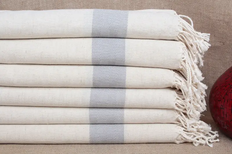Pure organic cotton characterizes the Turkish bath towel, resulting in high absorbency and quick drying. The towels are double face knitted, ensuring a versatile multipurpose use. Measuring 36x71 inches or 90x180 cm, with a tolerance of ± 2" or 5 cm, these towels weigh approximately 280 grams.