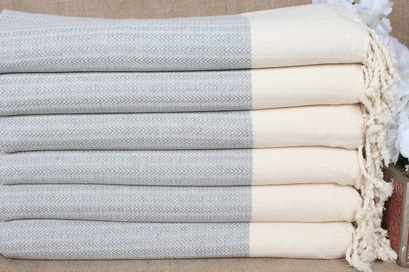 Turkish cotton towels, renowned for their durability and absorbency, are woven from pure organic cotton, ensuring high water absorption and quick drying times. These towels measure 36x67 inches or 90x170 cm, weighing approximately 420 grams. The hand-weaving process introduces a tolerance of ± 2 inches or 5 cm.