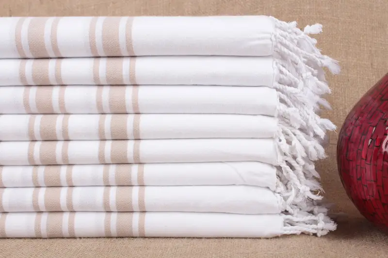 Characterized by their pure organic cotton composition, these towels are highly absorbent, ensuring quick drying. The material is sourced from Turkish cotton yarn, contributing to a weight of approximately 280 grams per towel. The size is 40x71 inches, or 100x180 centimeters, with a tolerance of ±2 inches or 5 centimeters due to hand weaving.