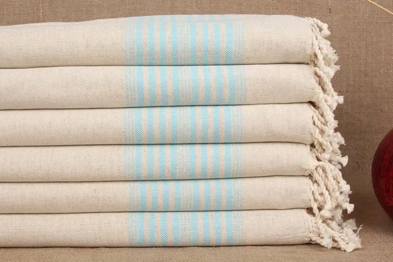 Turkish cotton towels are characterized by their double face knitting, ensuring eco-friendly and multipurpose usability. Consisting of pure organic cotton, these towels exhibit high absorbency and rapid drying capabilities, with a weight of approximately 315 grams. The dimensions measure 40x79 inches, equating to 100x200 centimeters, with a permissible tolerance of ±2 inches or 5 centimeters due to the hand-weaving process.