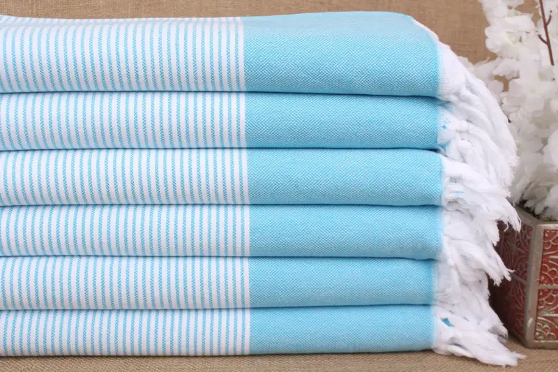 Turkish cotton towels, renowned for their high absorbency, are crafted from 100% organic cotton yarn, ensuring durability and quick drying. Characterized by their double-face knitting, these towels are meticulously handwoven, resulting in a size of 40x71 inches (100x180 cm) with a tolerance of ±2 inches (5 cm) due to weaving techniques. Weighing approximately 300 grams, these towels exhibit a plush texture that softens with each wash.
