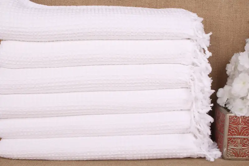 The White Waffle Turkish Towel Peshtemal is constructed from 100% cotton, ensuring a lightweight, absorbent, and quick-drying fabric ideal for various uses such as bath, beach, sauna, spa, and travel. Its dimensions are precisely 36x67 inches (90x170 cm), with a slight variance within the range of 1-2.5 cm due to hand weaving. Weighing approximately 300 grams, this towel is designed for easy packing and versatile application.