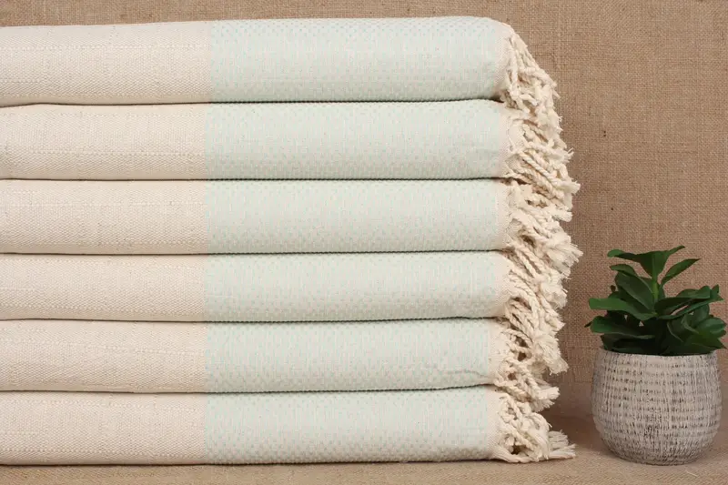 Pure organic cotton is characterized by its high absorbency, ensuring rapid drying. It is meticulously handwoven, resulting in a double-face texture. Dimensions measure 40x71 inches or 100x180 centimeters with a hand-weaving tolerance of ± 2 inches or 5 centimeters.