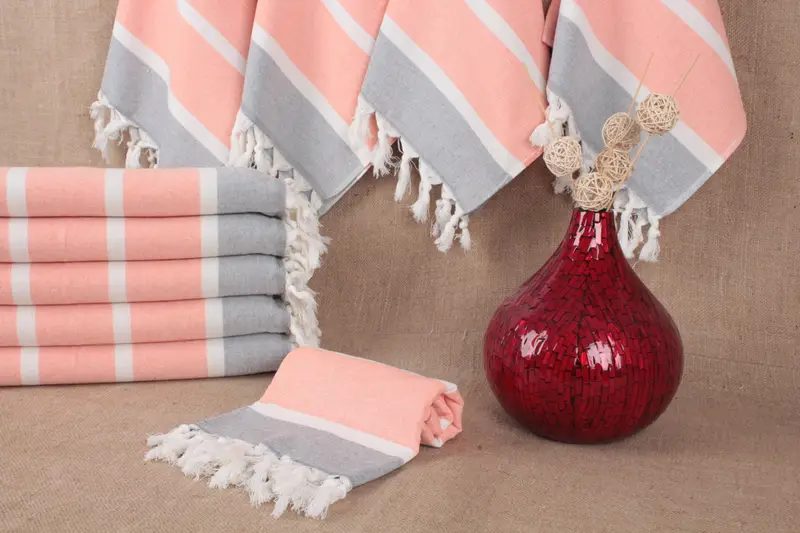 Handmade Turkish towels are characterized by pure organic cotton, ensuring exceptional absorbency and quick drying. This high-quality fiber composition weighs approximately 120 grams and measures 18x36 inches (45x90 cm) with a tolerance of ±2 inches or 5 cm due to weaving techniques. Customization options include embroidered monograms with specific monogram letters, colors, font selections, and placement preferences.