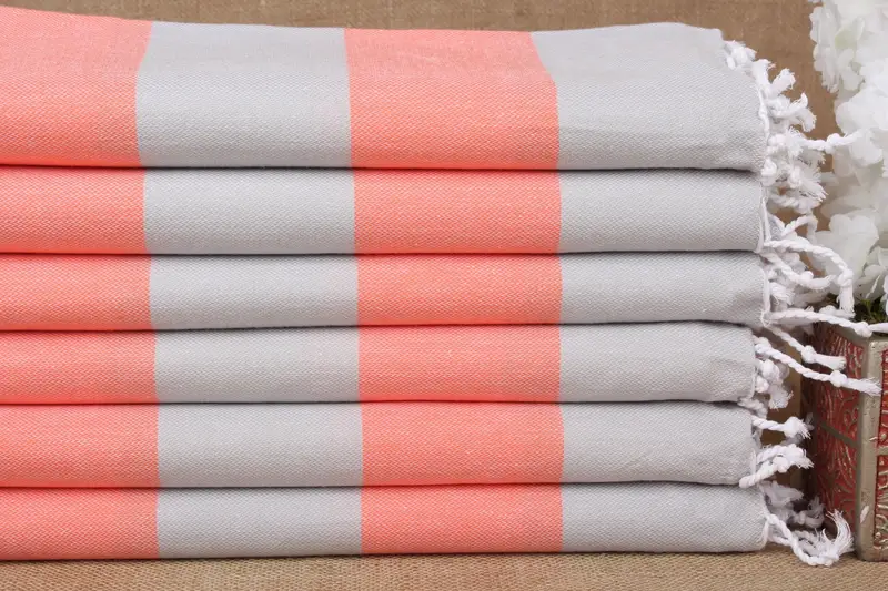 Turkish towels are comprised of pure organic cotton, ensuring high absorbency and rapid drying. Characterized by a size of 40x71 inches or 100x180 centimeters, these towels have a tolerance of ±2 inches or 5 centimeters in their weaving. The weight of each towel is approximately 290 grams, offering a balance of durability and lightness.