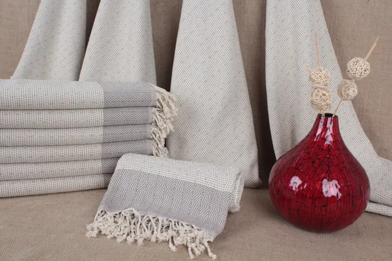 Characterized by pure organic cotton composition, these Turkish towels are renowned for their high absorbency, ensuring efficient moisture wicking. Each towel, measuring 40x71 inches (100x180cm) and weighing approximately 470 grams, is double face knitted with a hand-weaving tolerance of ± 2 inches or 5 centimeters. These towels are available for personalization through embroidered monograms, offering a bespoke touch to their versatile design.