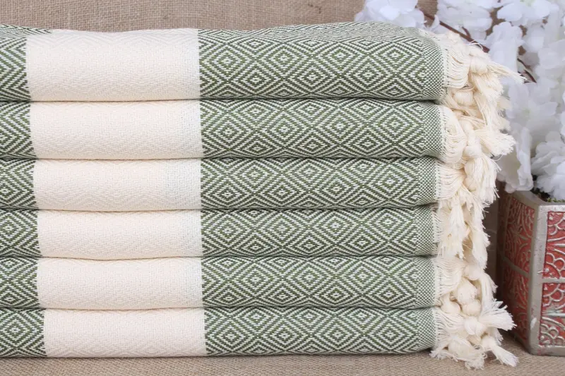Pure organic cotton characterizes the construction of the Turkish Towels, ensuring high absorbency and rapid drying. These towels, resulting in a weight of approximately 420 grams, are hand-woven with a double face knitting technique. Their size is specified at 40x71 inches (100x180 cm), with a hand-weaving tolerance of ±2 inches (5 cm).