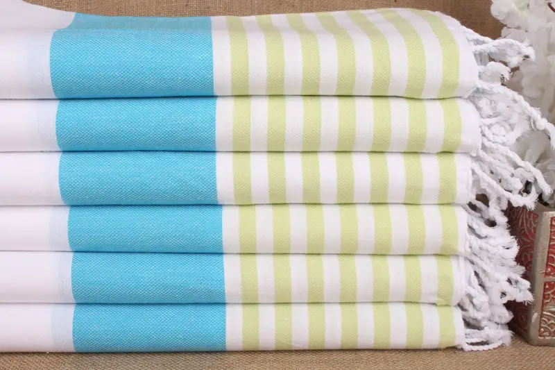 Characterized by pure organic cotton, the Turkish towel is highly absorbent, resulting in quick drying. Weighing approximately 280 grams, it offers a balance of lightweight portability and robustness. Its dimensions are 40x71 inches or 100x180 cm, with hand-weaving tolerances of ±2 inches or 5 cm.