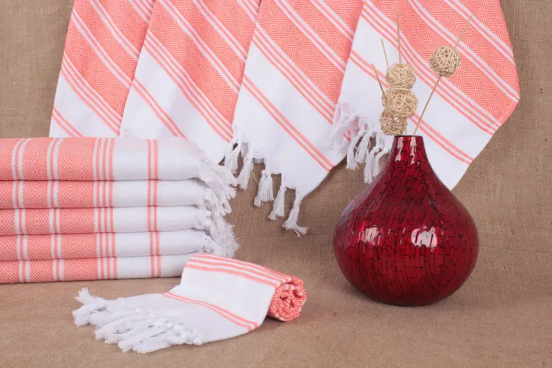 Characterized by the use of pure organic cotton, these towels exhibit excellent absorbency and quick drying capabilities, ensuring superior functionality. Weighing approximately 110 grams and measuring 18x44 inches or 45x110 centimeters, each piece is meticulously handmade with a double-face knitted structure. Weaving tolerances of ±2 inches or 5 centimeters are standard, maintaining consistency in product quality.