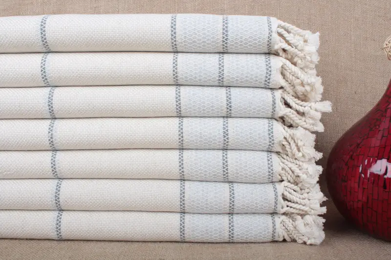 The Turkish towels, characterized by their pure organic cotton composition, ensure high absorbency and quick drying. These towels are double-face knitted, eco-friendly, and suitable for multiple purposes. Resulting in a weight of approximately 430 grams, the towels measure 36x71 inches or 90x180 cm with a tolerance of ±2 inches or 5 cm due to weaving techniques.