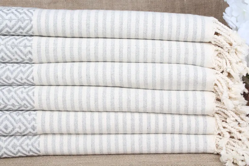 Turkish cotton ensures superior absorbency and quick-drying properties, making it an ideal material for a variety of uses. Characterized by its eco-friendly attributes, this light gray diamond towel measures 38x75 inches (95x190 cm) with a tolerance of ±2" (5 cm) due to its hand-weaving process, and weighs approximately 400 grams. Resulting in a multi-purpose tool, it is customizable with embroidered monograms, enhancing its appeal as a personalized wedding gift or anniversary present.