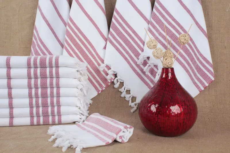 The Turkish towels exhibit a blend characterized by 100% pure organic cotton, ensuring a high level of absorbency and rapid drying. The fiber composition includes double-face knitted, eco-friendly, high-quality, washable organic cotton that is suitable for multiple purposes.