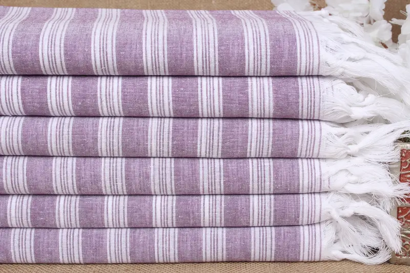 Turkish towels are made from pure organic cotton, ensuring high absorbency and quick drying. These towels exhibit dimensions of 40x71 inches (100x180 cm) with a weight of approximately 210 grams. The hand-weaving process results in a tolerance of ±2 inches or 5 centimeters.
