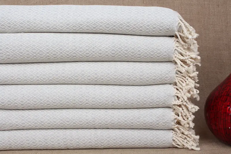 Organic cotton characterizes the composition of these handmade towels, ensuring high absorbency and quick drying. Each piece, hand-knitted with pure Turkish cotton yarn, weighs approximately 400 grams and measures 40x71 inches or 100x180 centimeters with a permissible deviation of 2 inches or 5 centimeters. Customization is available through monogram embroidery, allowing for personalized gifts such as bridesmaid presents or wedding favors.