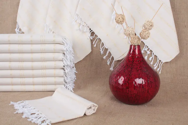 These Turkish tea towels are characterized by their pure organic cotton composition, renowned for its high absorbency and quick-drying properties. The towels are double-faced, knitted by hand, and exhibit a weight of approximately 90 grams. Tolerances in dimensions are up to 2 inches or 5 centimeters due to the weaving process.
