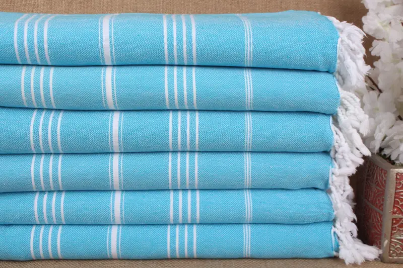 The Turkish cotton towel is characterized by its exceptional absorbency and quick drying time, ensuring a high-quality, multipurpose utility. The weight of the towel is approximately 280 grams. It measures 40x71 inches or 100x180 cm, with a weaving tolerance of ± 2 inches or 5 cm.
