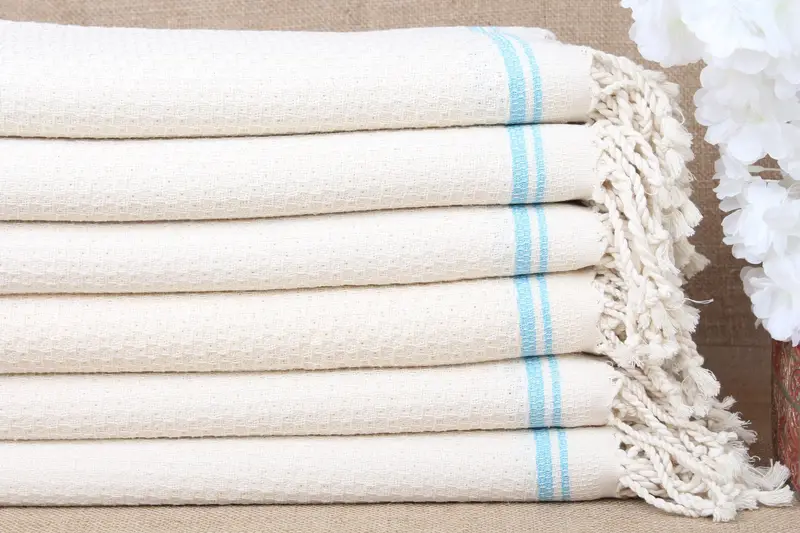 Constructed from pure organic cotton, the towel ensures maximum absorbency and quick drying. Characterized by double-face knitting, it provides versatility for multiple uses. Dimensions are 67x36 inches, translating to 170x90 cm with a tolerance of ± 2" or 5 cm due to hand-weaving techniques.