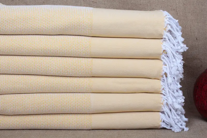 The organic cotton towels are characterized by their pure material composition, offering superior absorbency and quick drying. These handmade towels, double-face knitted, ensure a high-quality finish. Each piece measures precisely 38x71 inches or 95x180 cm, with a weight of approximately 360 grams. Weaving tolerances are within ± 2" or 5 cm due to the artisanal production process.