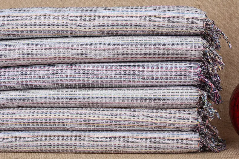 Characterized by pure organic cotton fibers, this towel ensures high absorbency and quick drying. Resulting in a weight of approximately 120 grams, it is double-faced and hand-knitted with a tolerance of ±2 inches or 5 centimeters.