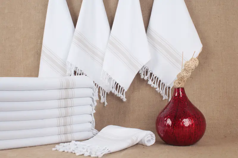 Custom embroidery options include monogram letters, logo, and color selection. Pre-shrunk status ensures consistency in dimensions. Turkish towels can be machine washed at 30-40°C, with recommended hand drying.