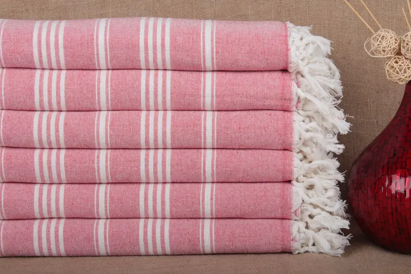Turkish bath towels exhibit excellent absorbency resulting from their pure organic cotton composition. These towels, characterized by their light weight of approximately 430 grams, measure 40x71 inches or 100x180 centimeters, allowing for ±2 inches or 5 centimeters tolerance in weaving. Hand-weaving ensures precision, with each towel being a unique piece.