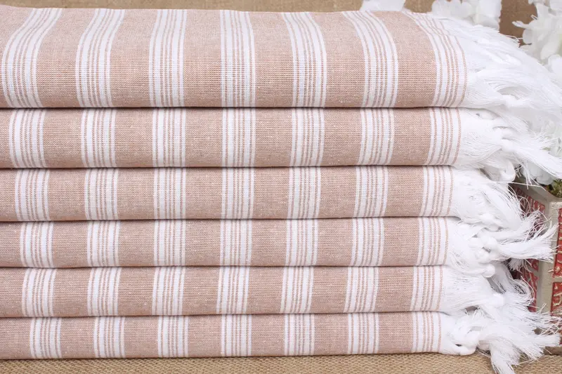 Characterized by their double face knitting, the Turkish Bath Towels are woven from pure organic cotton, ensuring a lightweight and highly absorbent texture. These towels measure 40x71 inches (100x180cm) with a weight of approximately 210 grams, exhibiting a hand-weaving tolerance of ±2 inches or 5cm. Resulting in a pre-shrunk status after initial wash, these towels offer a versatile embroidery customization service, including monogram options, enhancing their utility and aesthetic appeal.