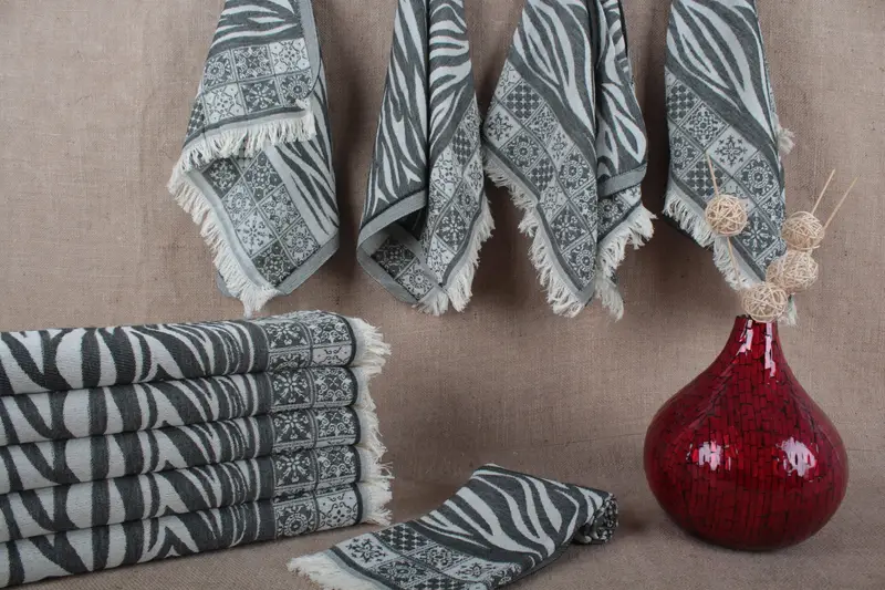 The Turkish towels are characterized by their fiber composition, specifically pure organic cotton, ensuring superior absorbency and quick drying. These towels have a hand-weaving tolerance of up to 2 inches or 5 cm due to traditional techniques, maintaining high quality. Each towel, weighing approximately 650 grams, measures 20x28 inches or 50x70 cm, offering a versatile option for various uses.