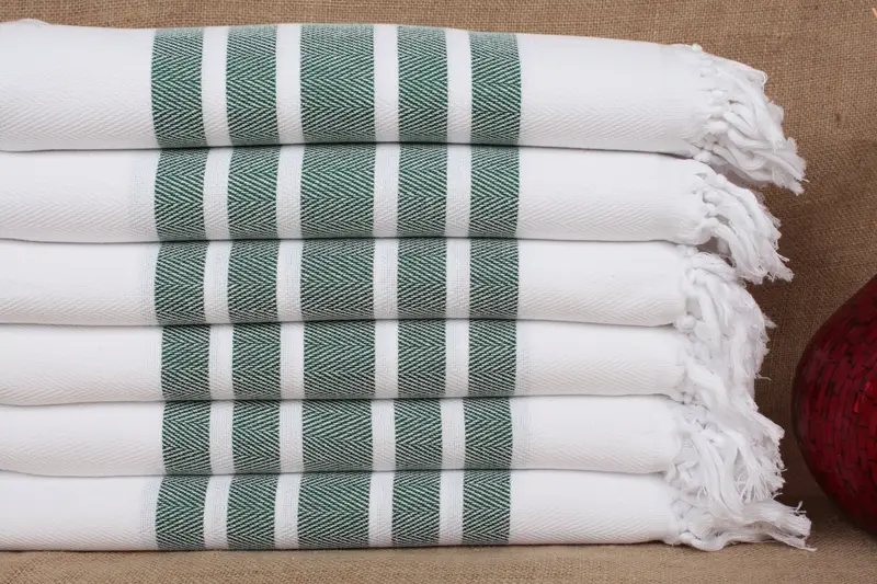 Turkish cotton towels, sourced from Turkish yarn, ensure exceptional absorbency. They are double-faced, knitted by hand, and made from 100% organic cotton. Resulting in a lightweight towel measuring 40x71 inches (100x180cm) with a weight of approximately 380 grams, tolerating a weaving variance of ±2 inches (5cm).
