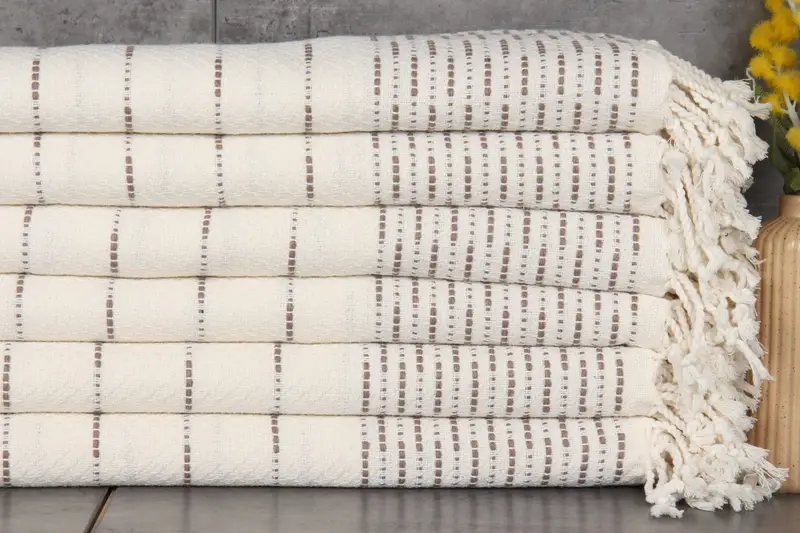 Crafted from organic cotton, these towels and blankets have dimensions of 38x71 inches or 95x180 centimeters. Weighing 420 grams, they are pre-shrunk with a tolerance of 1-2.5 cm. This ensures consistent product quality despite hand-weaving.