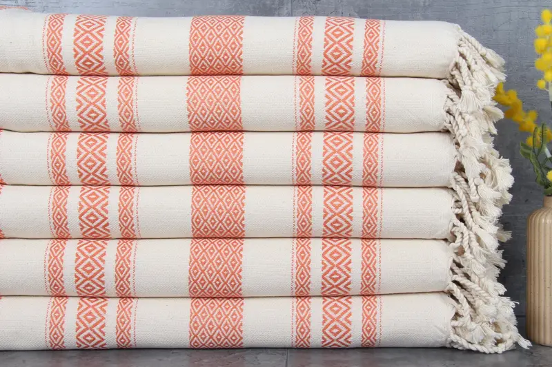Produced from 100% organic Turkish cotton, these towels exhibit superior absorbency, characterized by their ability to absorb water more effectively with each wash. The towels measure 36x71 inches or 90x180 centimeters, with a weight of 400 grams. The hand-weaving process results in tolerances of 1-2.5 centimeters, ensuring slight variations.