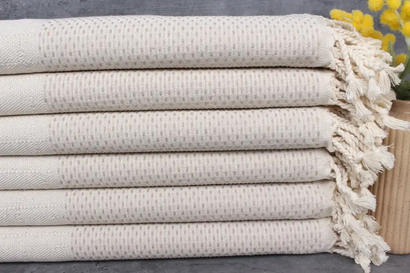 Characterized by 100% organic Turkish cotton, the towels ensure enhanced absorbency and natural dye hues. These towels, weighing 480 grams, feature a dimension of 40x71 inches or 100x180 centimeters, with a slight hand-weaving tolerance of 1-2.5cm. Ensuring their pre-shrunk status, initial washing should be separate to maintain longevity.
